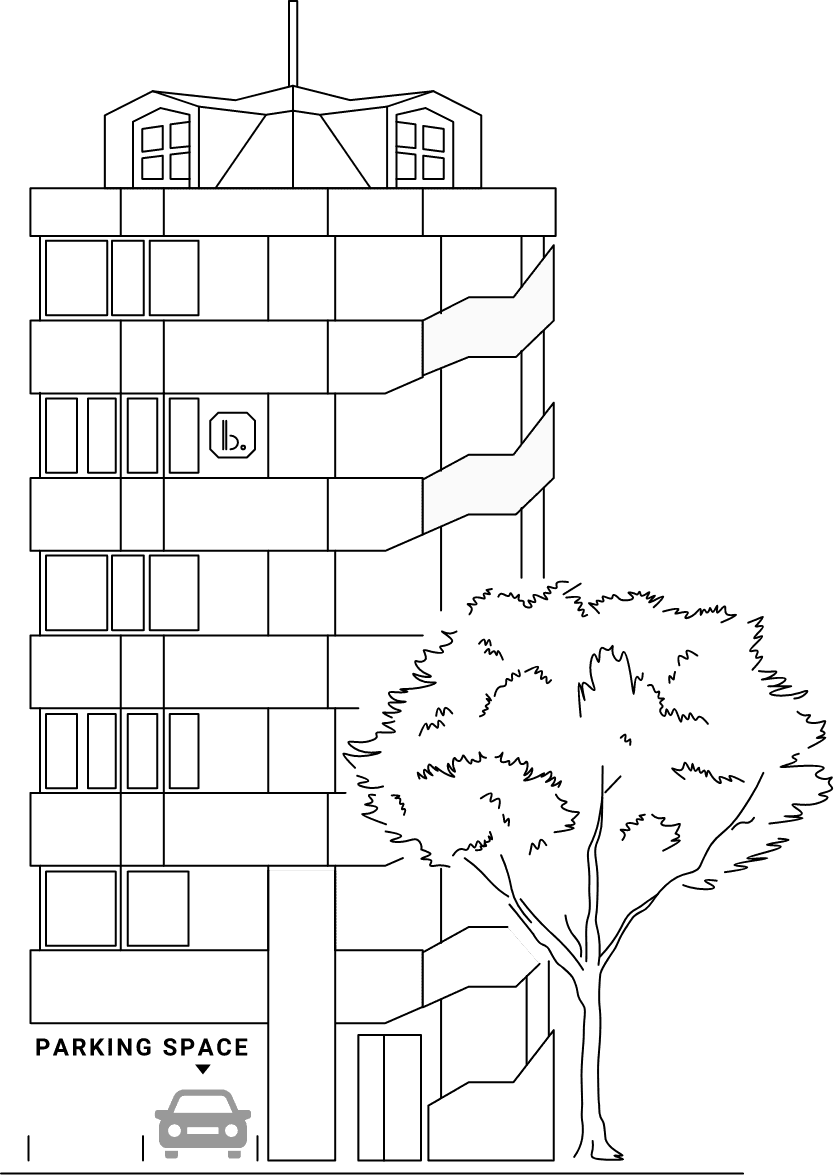 お車でお越しの場合、ビル 1F にある 駐車場(向かって右側手前)をご利用ください。